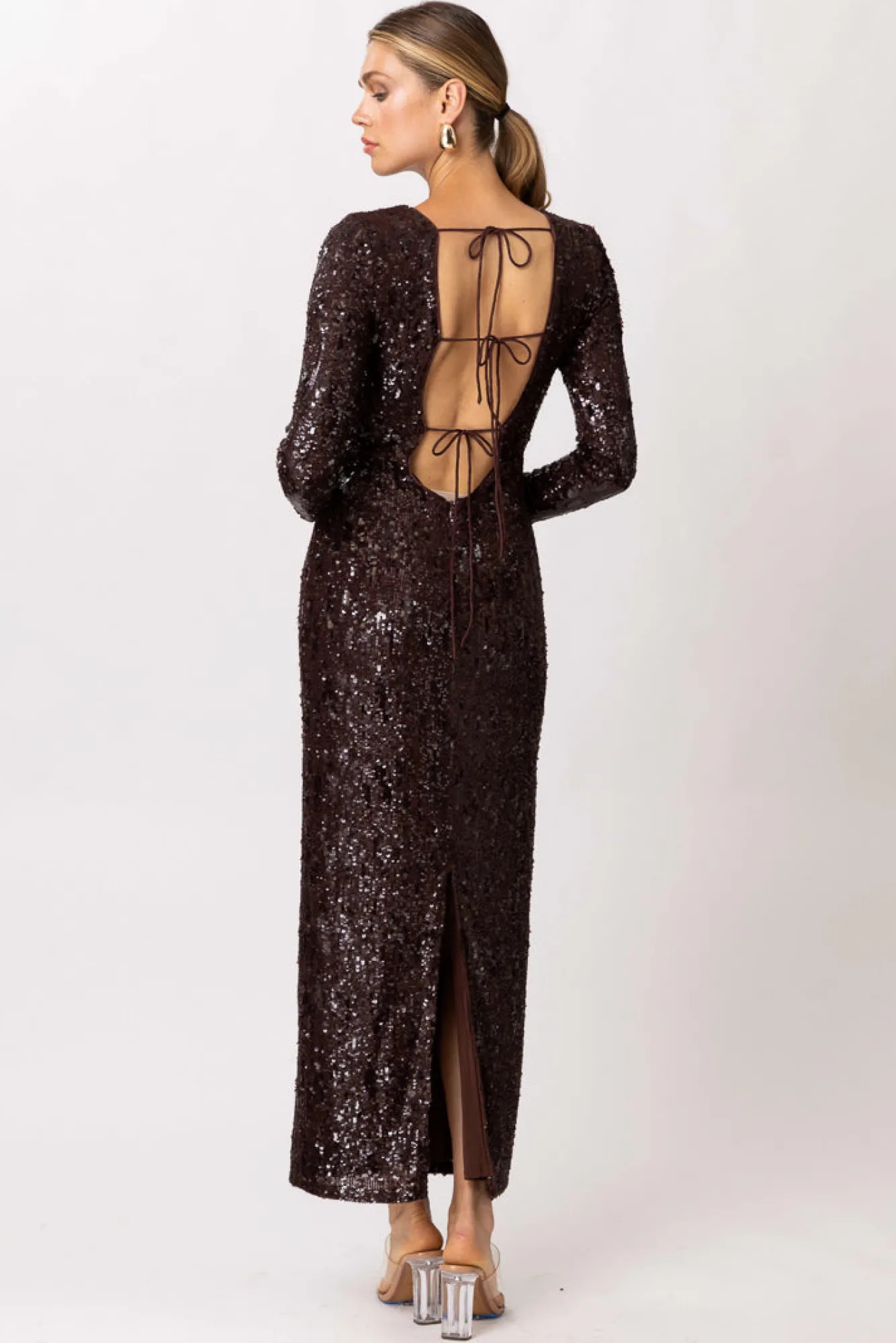 – Lightweight, stretch mesh with sequins- Long sleeves- Scooped back with adjustable back ties – Hook-and-eye and hidden…