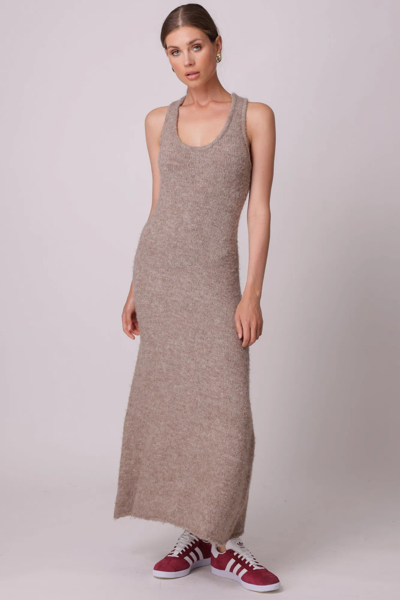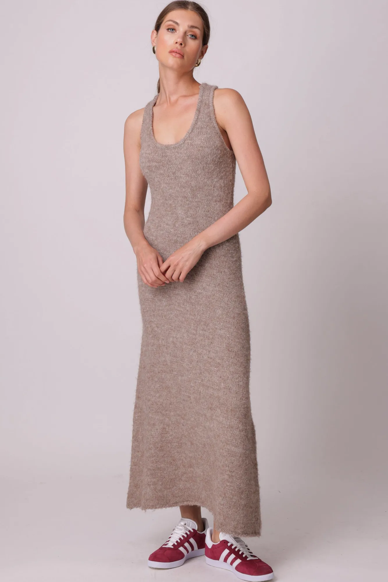 – Knit sweater- Sleeveless- Scoop neckline- UnlinedModel measurements:Size S: The model is 5’10″/177.8cm