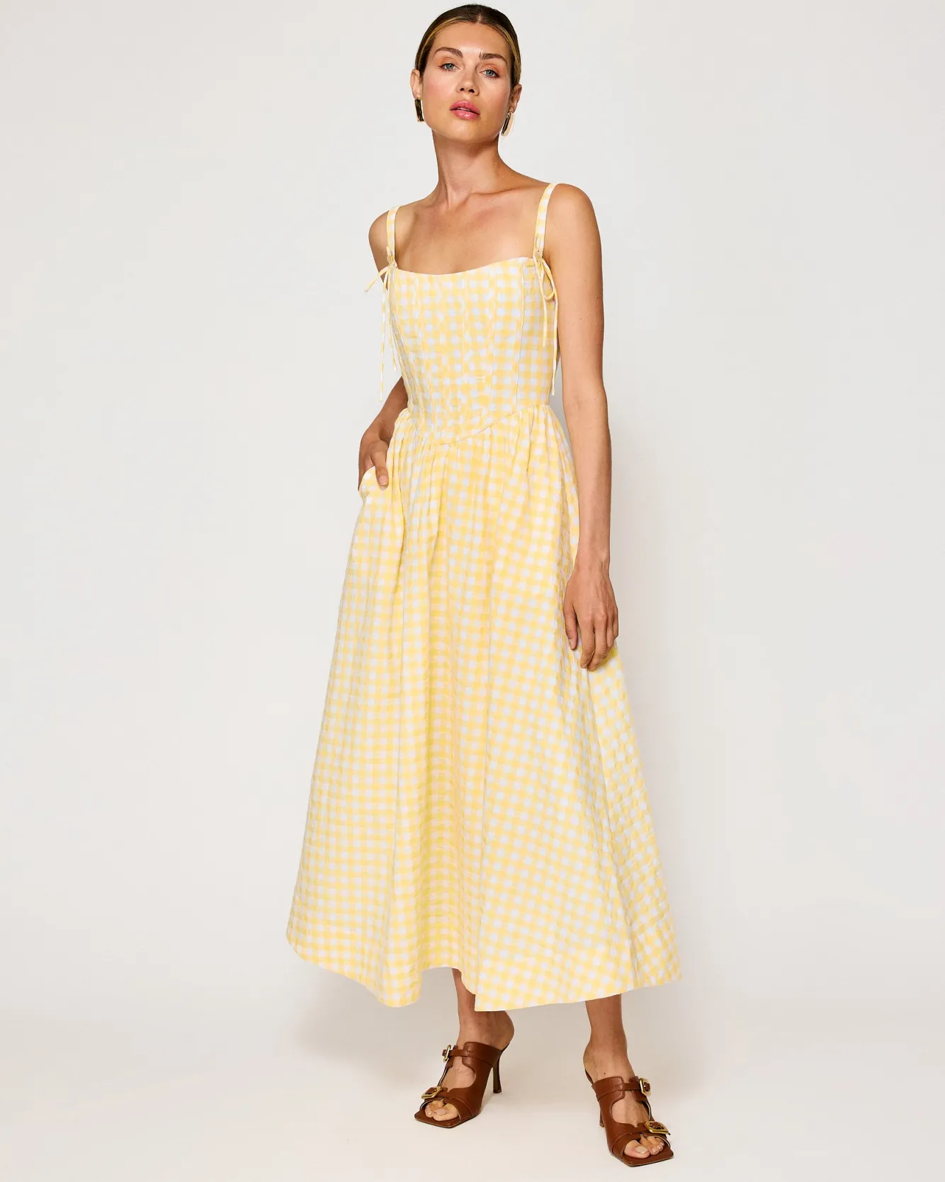 – Lightweight, textured fabric- Gingham checked print- Corset design- Self spaghetti tie details- Hook-and-eye and back …