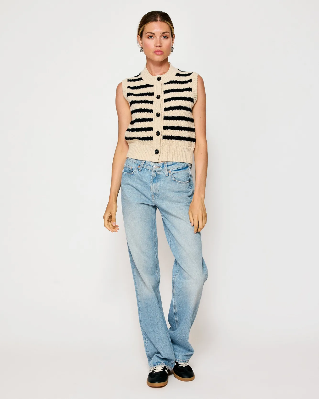 – Mid-weight knit sweater fabric- Striped pattern- Sleeveless- Button placketModel measurements:Size S: The model is 5’1…