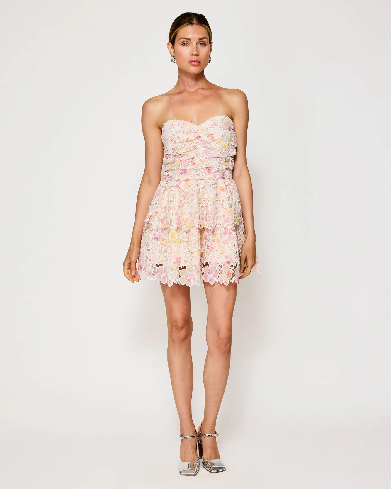 – Embroidered eyelet lace fabric- Floral print- Strapless- Sleeveless- Partial smocking detail at back- Tiered skirt- Ho…