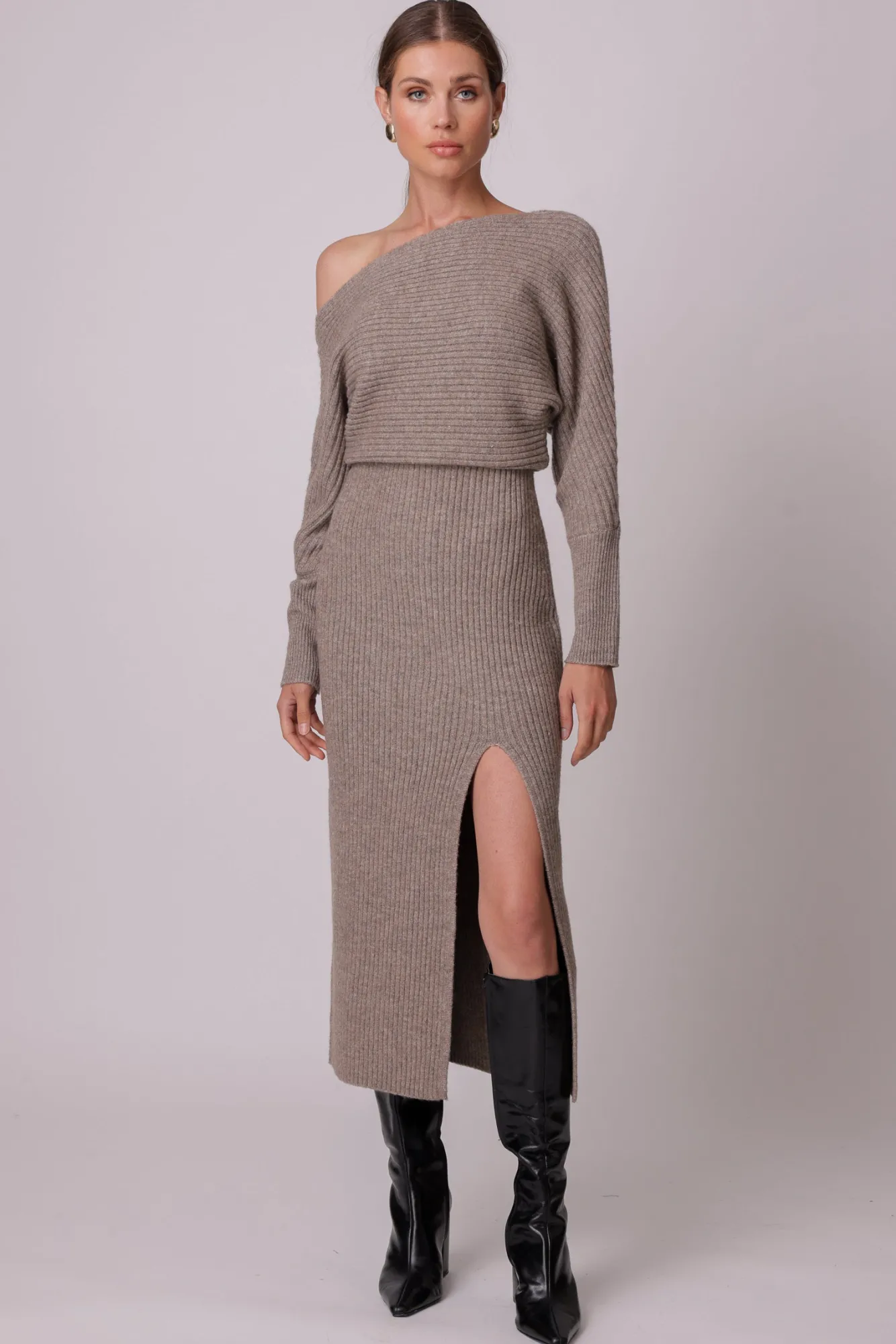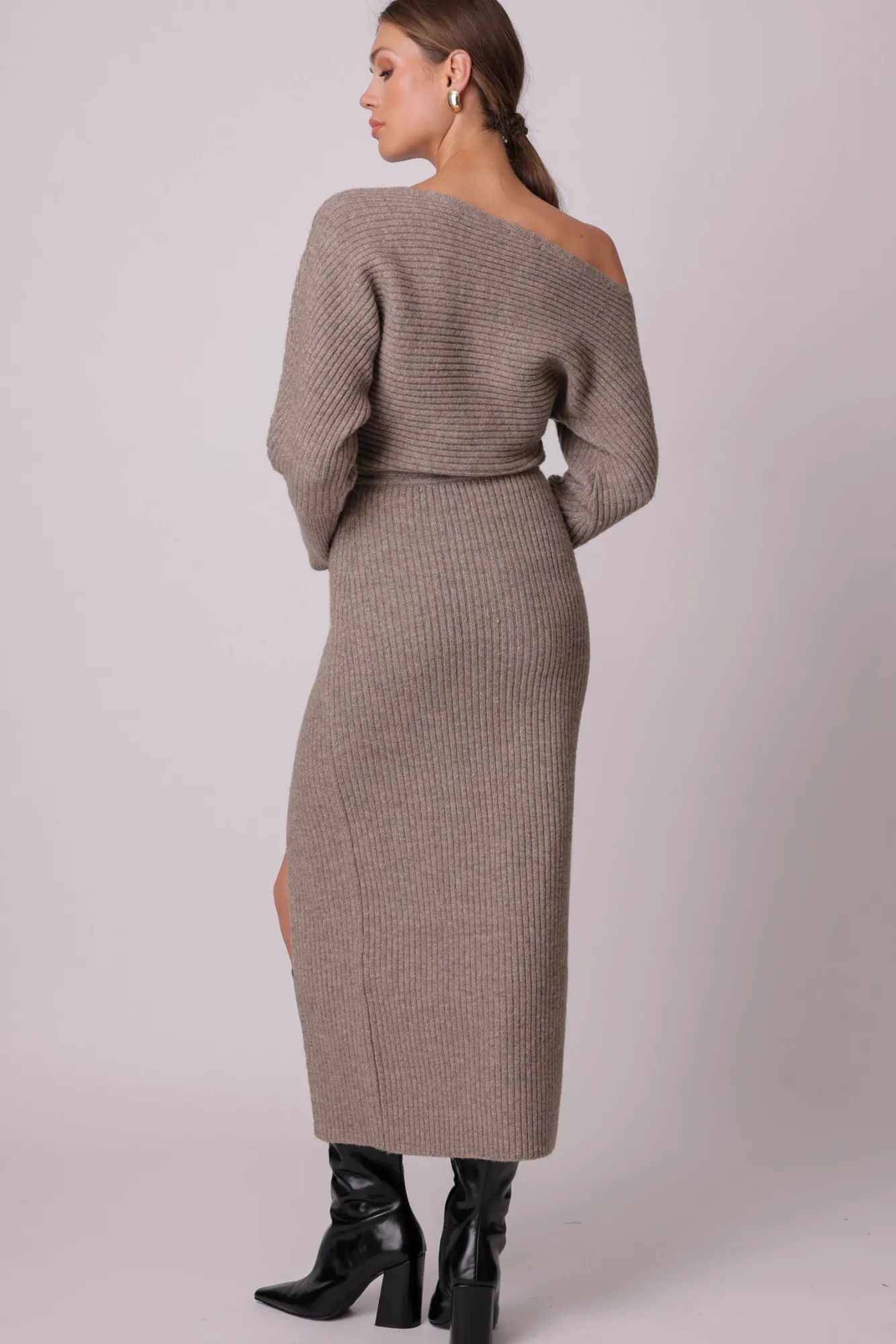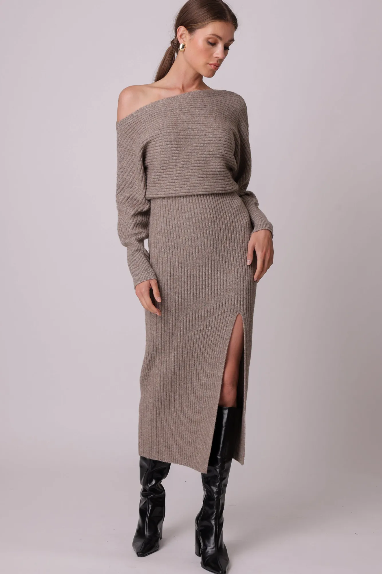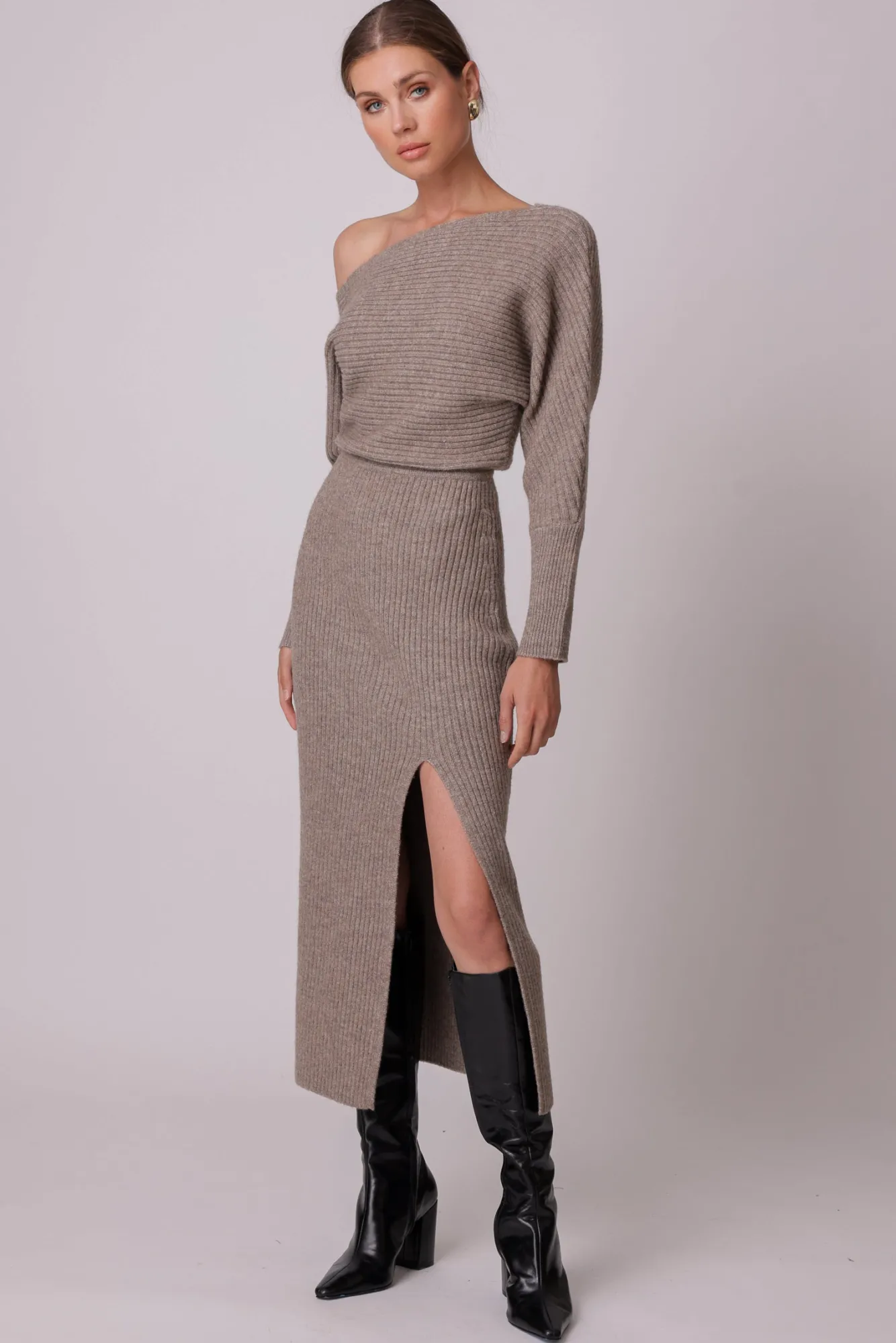 – Wide rib knit sweater- Off the shoulder design-Wide ribbed knit fabric with side seam slit- Pull over design, no closu…