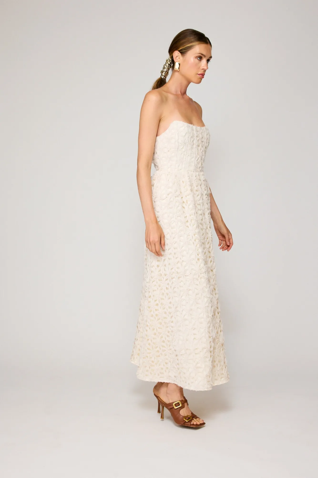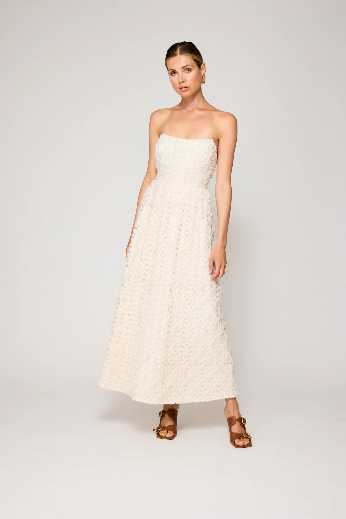 – Openwork detailed self fabric- Strapless corset design bodice with boning- Sleeves- Hook-and-eye and hidden zip at sid…