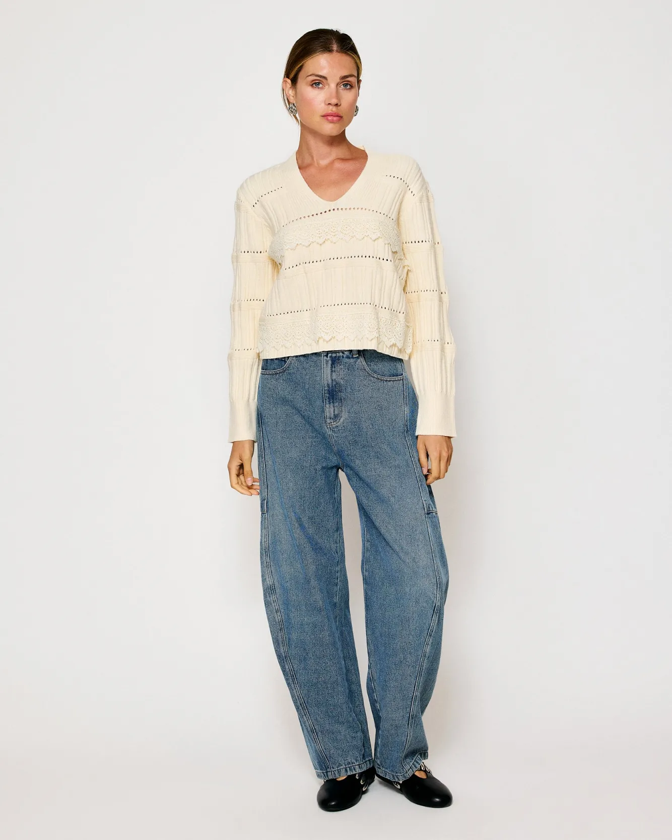 – Mid-weight knit sweater fabric- V-neckline- Lace trim detailed- Long sleeves with ribbed cuffs- Pullover design, no cl…