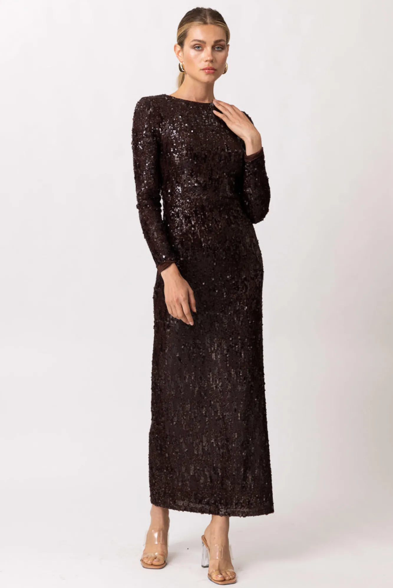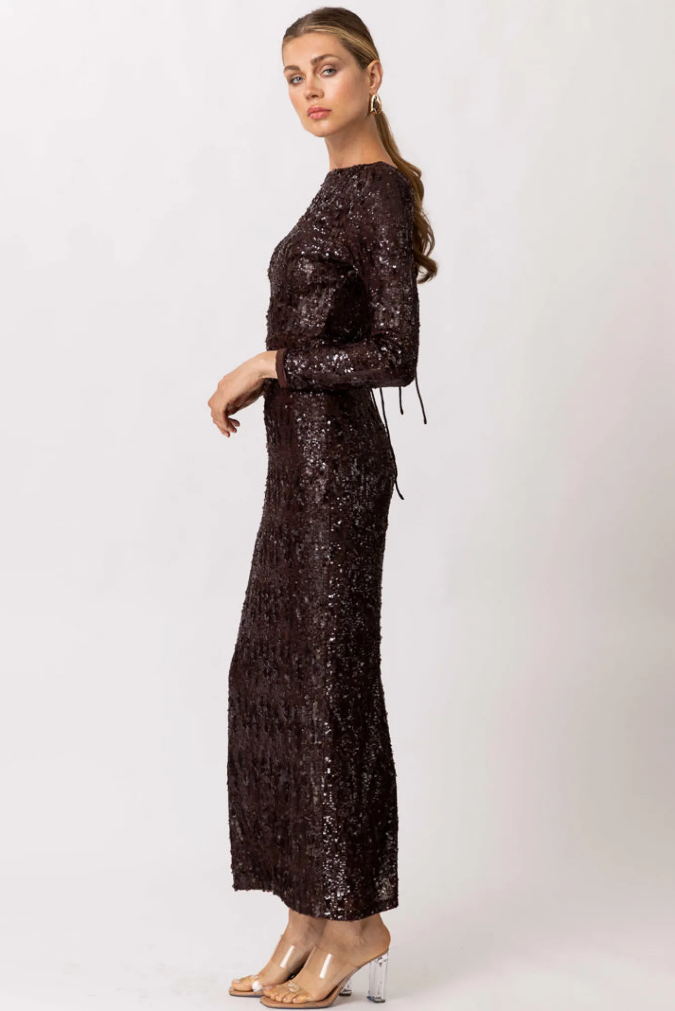 – Lightweight, stretch mesh with sequins- Long sleeves- Scooped back with adjustable back ties – Hook-and-eye and hidden…