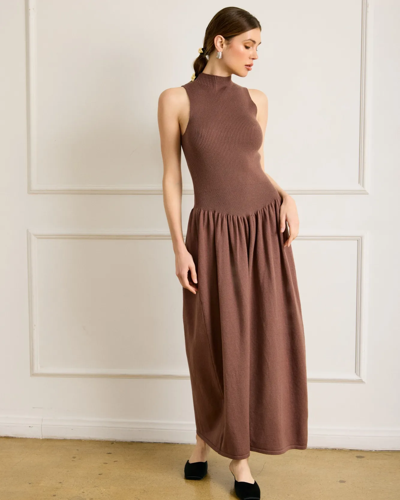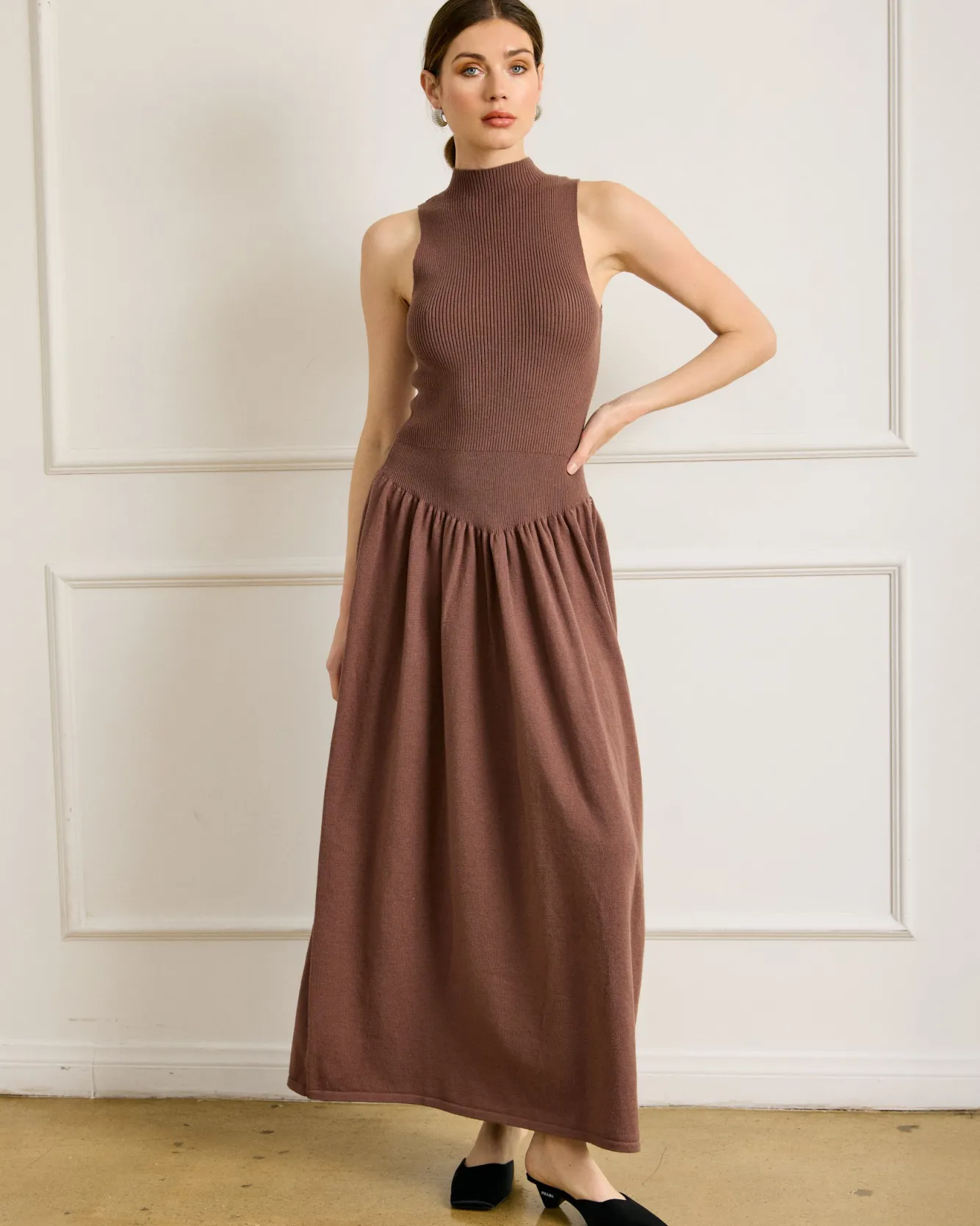 – Mid-weight knit sweater fabric- Mock neck- Sleeveless- Unlined