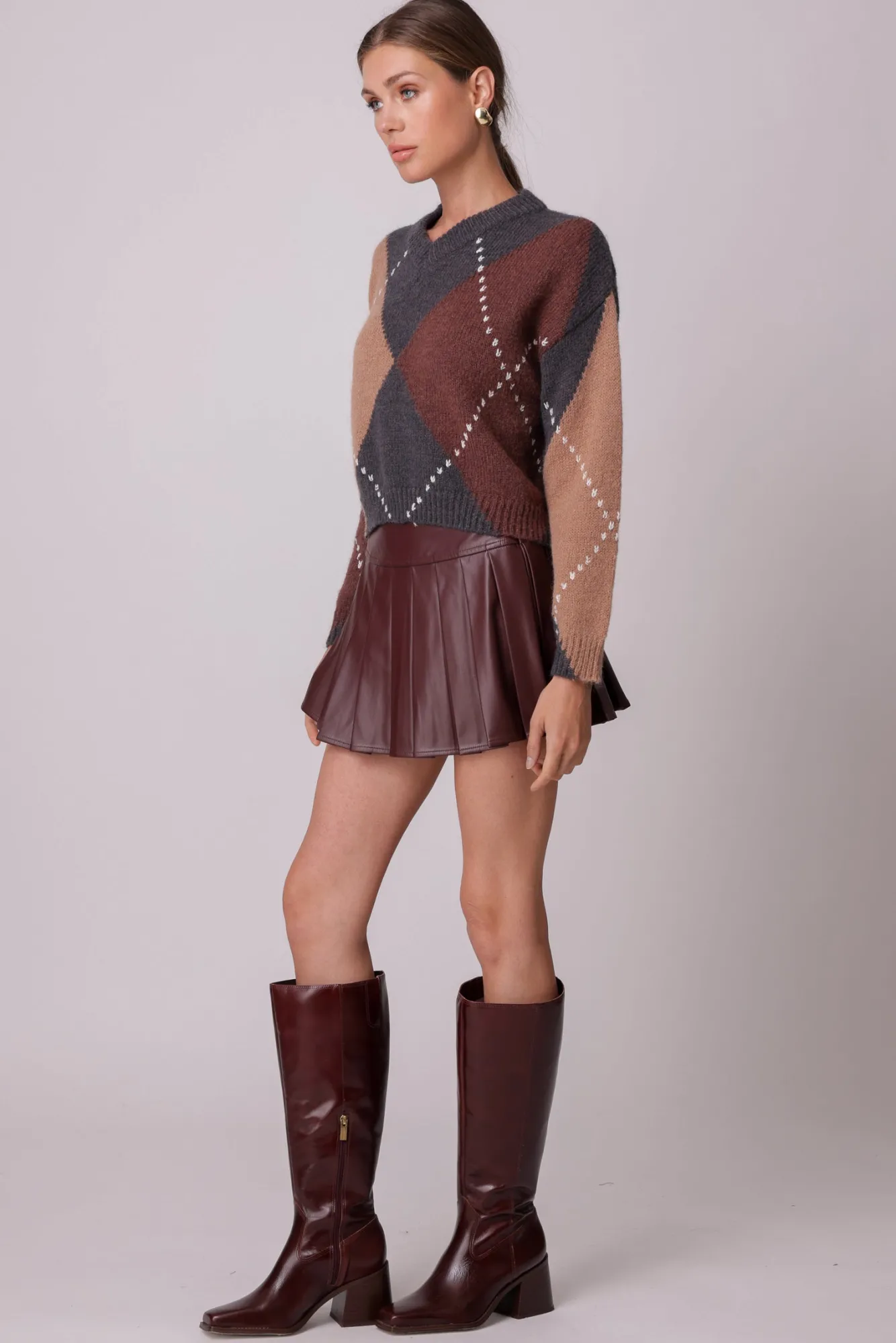 – Mid-weight faux leather with stretch- Box pleated- Hook-and-eye and hidden zip at side- UnlinedModel measurements:Size…