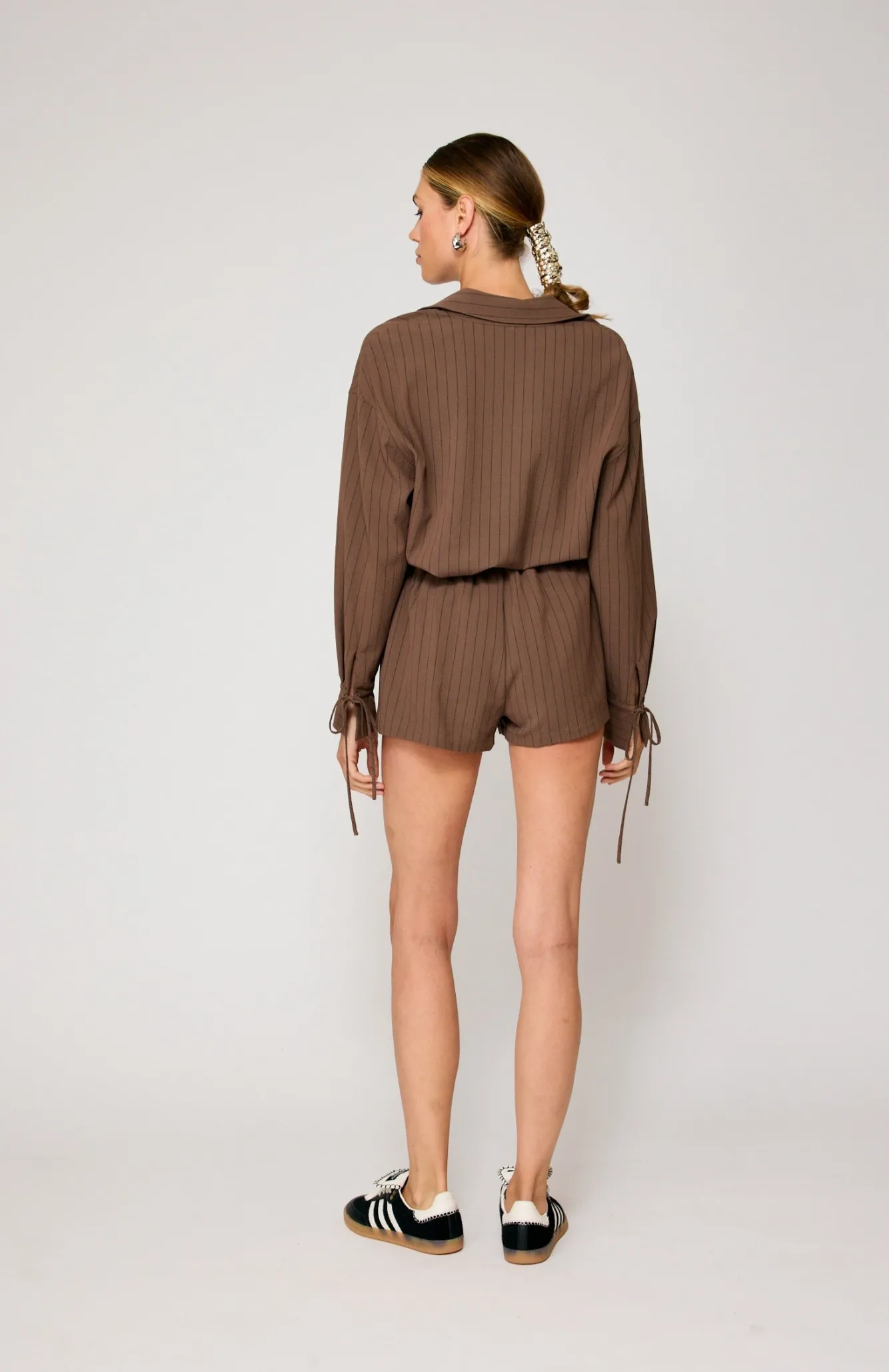 – Striped seersucker fabric- Faux wrap design with shorts underlay- Self spaghetti strap tied at side- Covered elastic a…