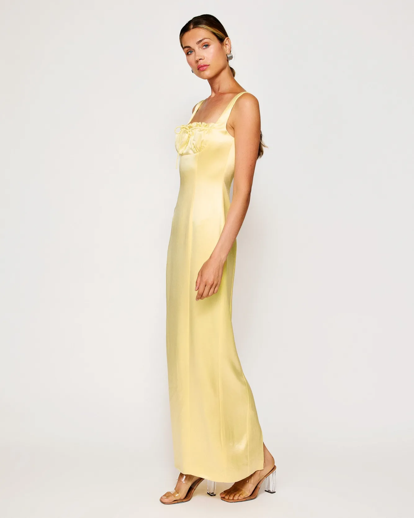 – Mid-weight satin effect fabric- Sleeveless- Ruffle detail along the cup- Self spaghetti tie detail- Hook-and-eye and h…