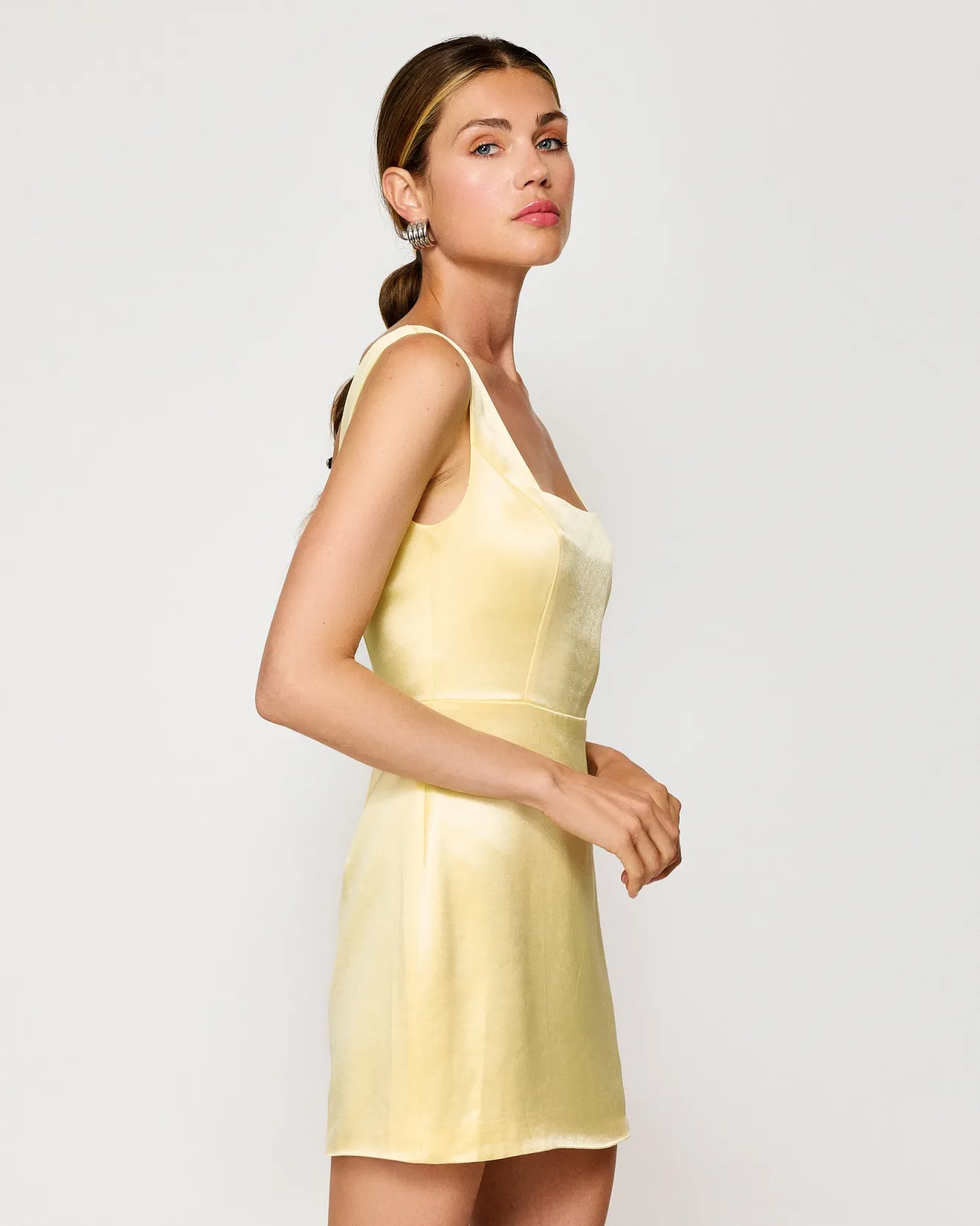 – Mid-weight satin effect fabric- Sleeveless- Square neckline- Hook-and-eye and hidden back zip- Fully linedModel measur…