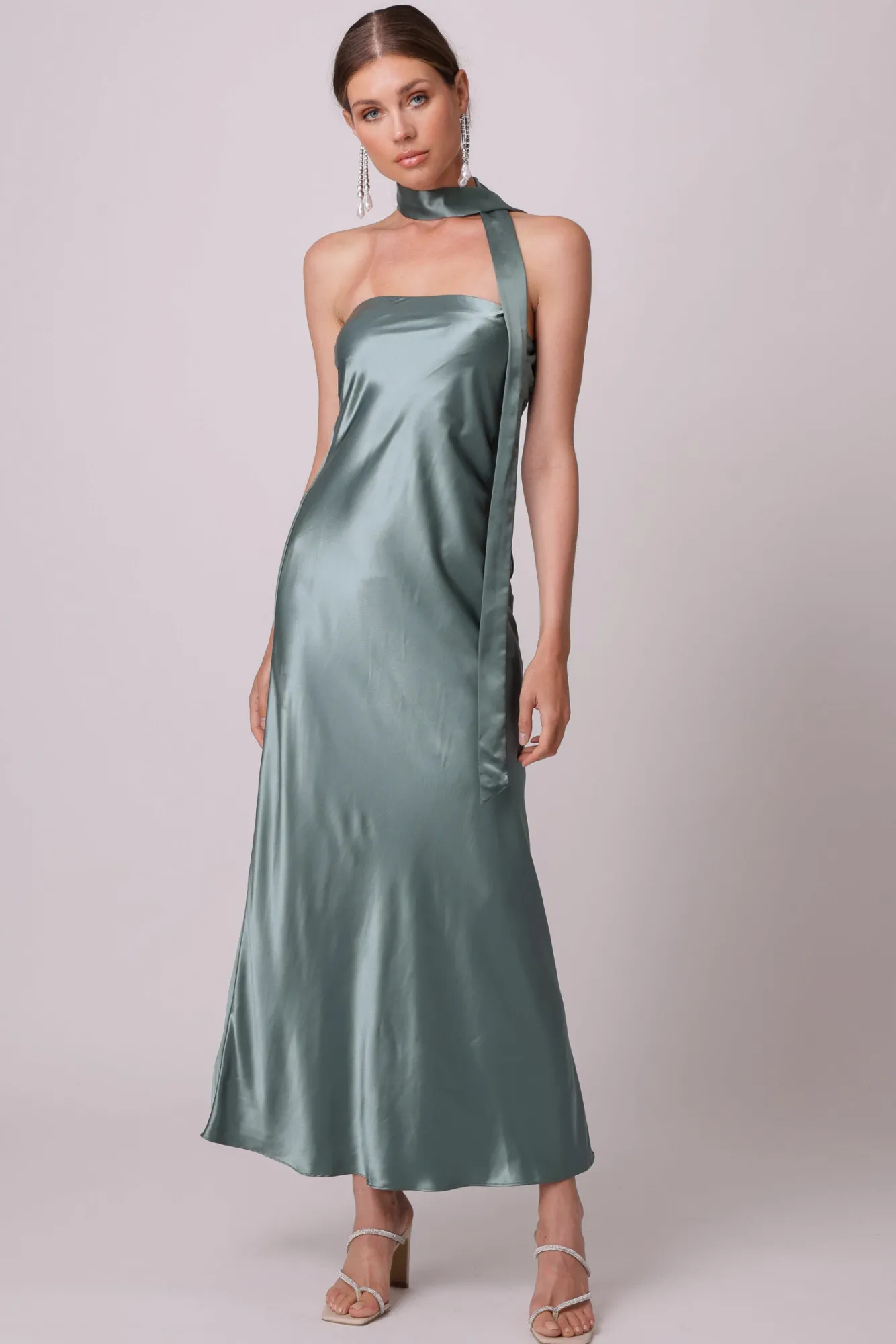 – Lightweight non-stretch satin fabric- Dettachable self scarf- Strapless neckline with covered elastic- Sleeveless- Bia…