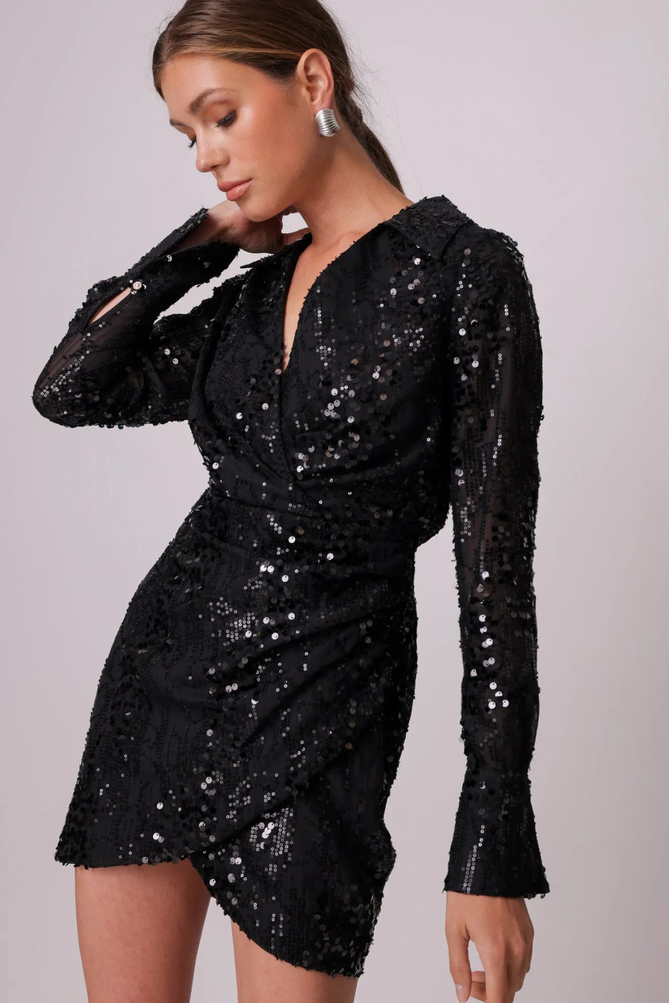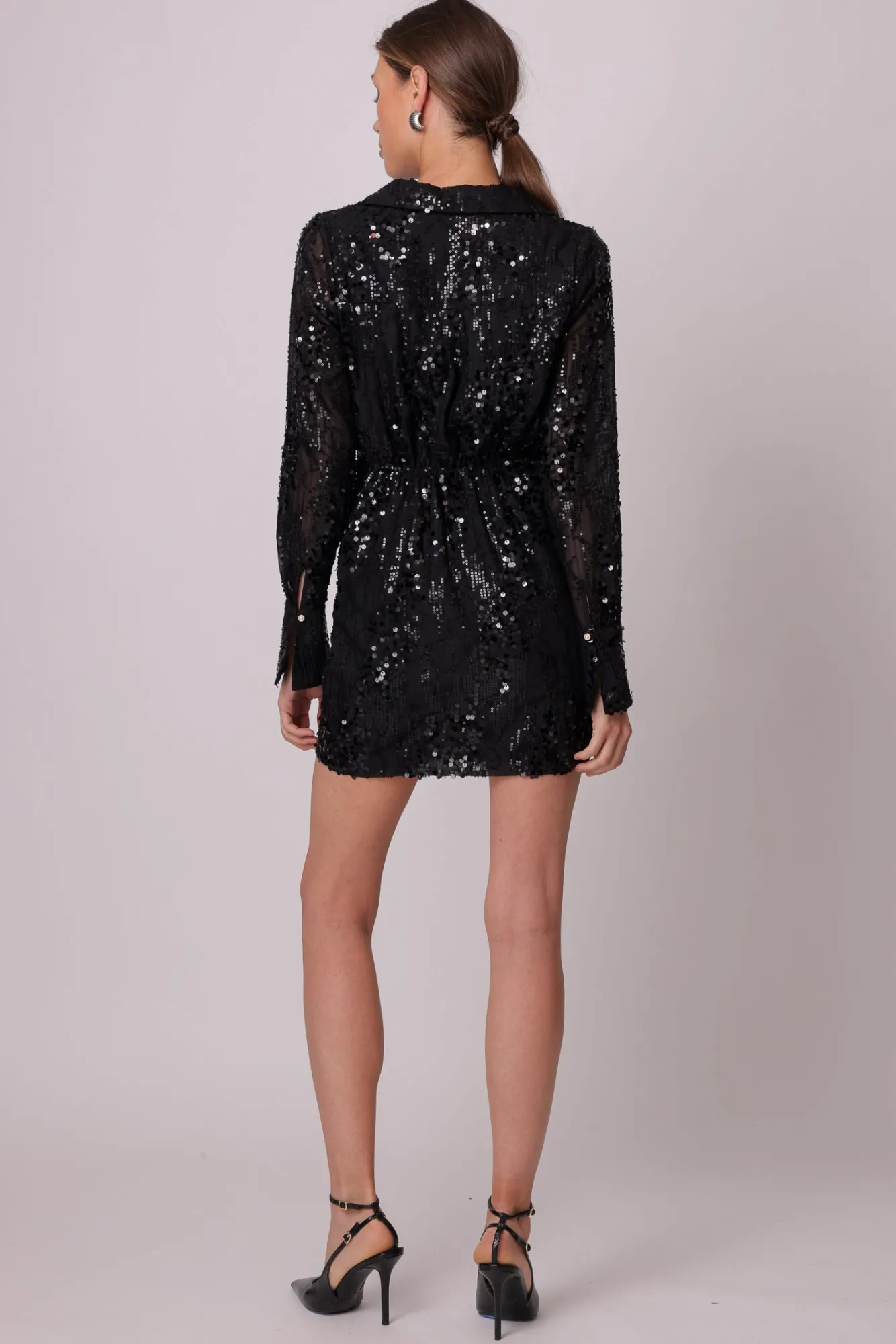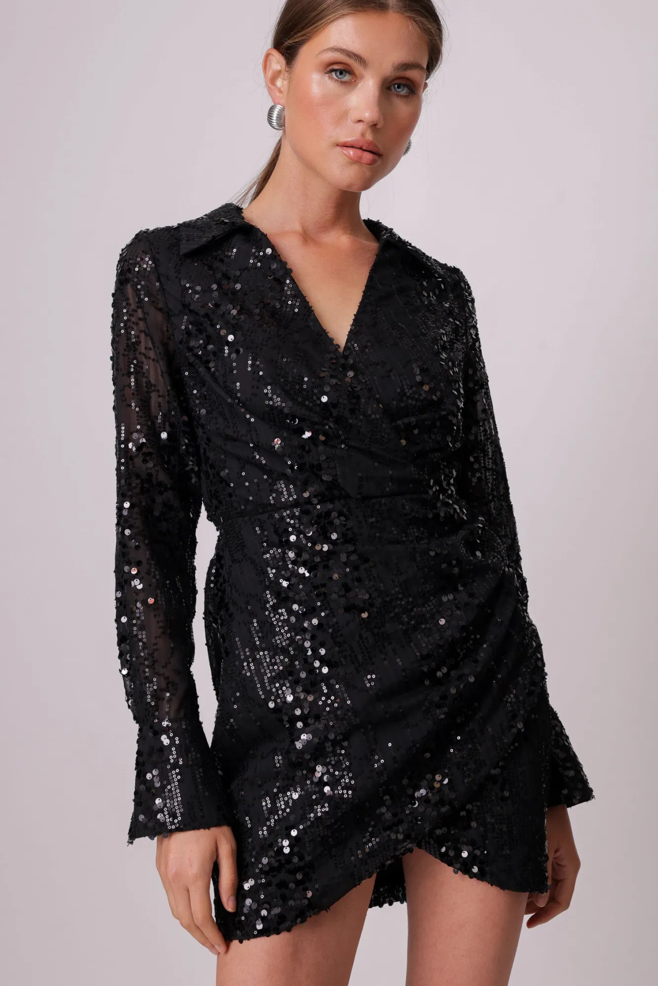 – Sequins embellished chiffon fabric- Collared neckline- Long sleeves- Hook-and-eye and hidden zip at side- LinedModel m…