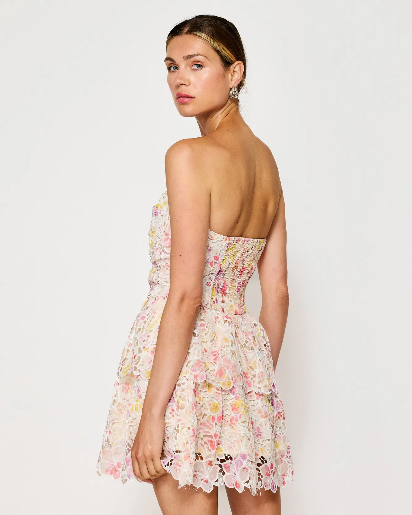 – Embroidered eyelet lace fabric- Floral print- Strapless- Sleeveless- Partial smocking detail at back- Tiered skirt- Ho…
