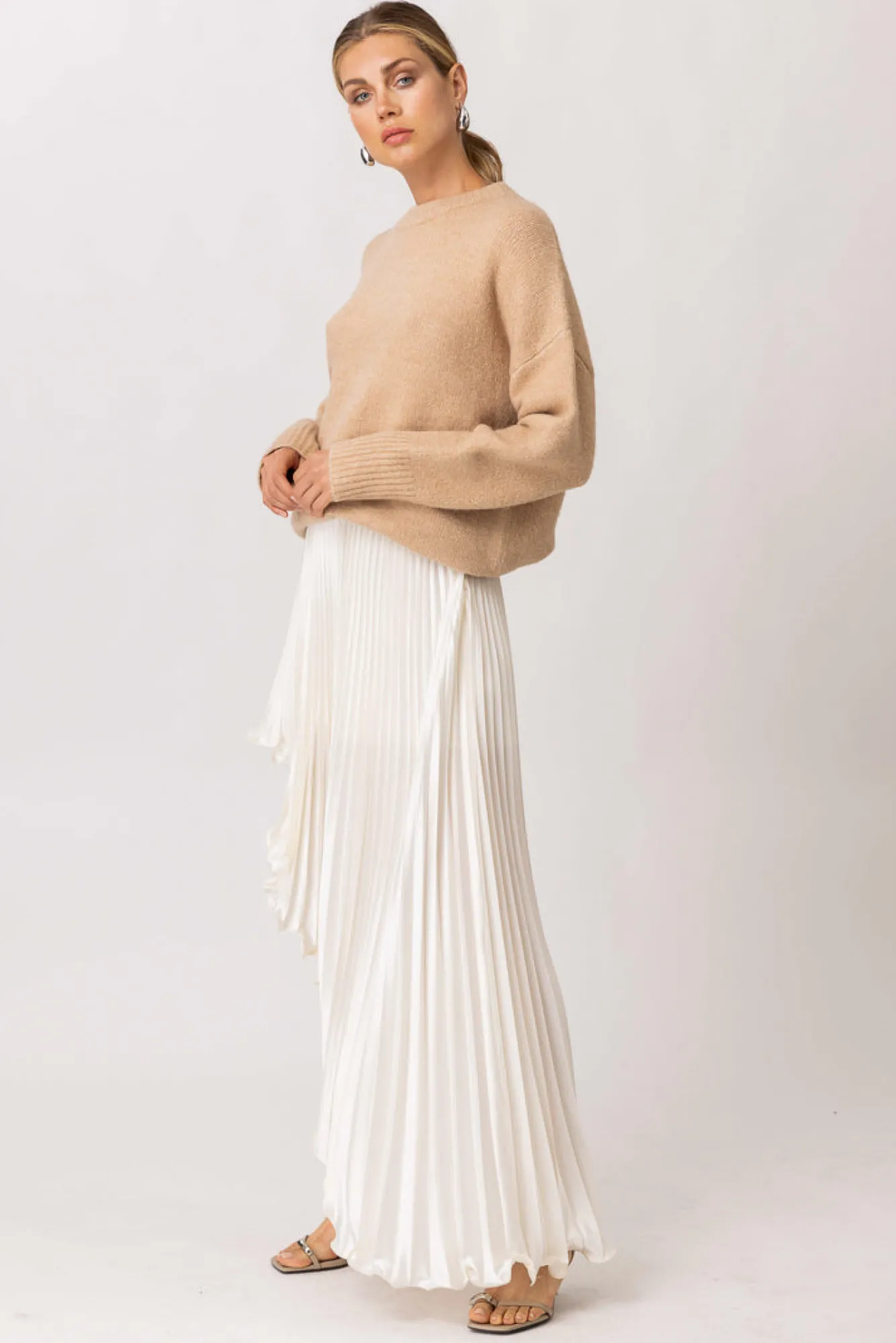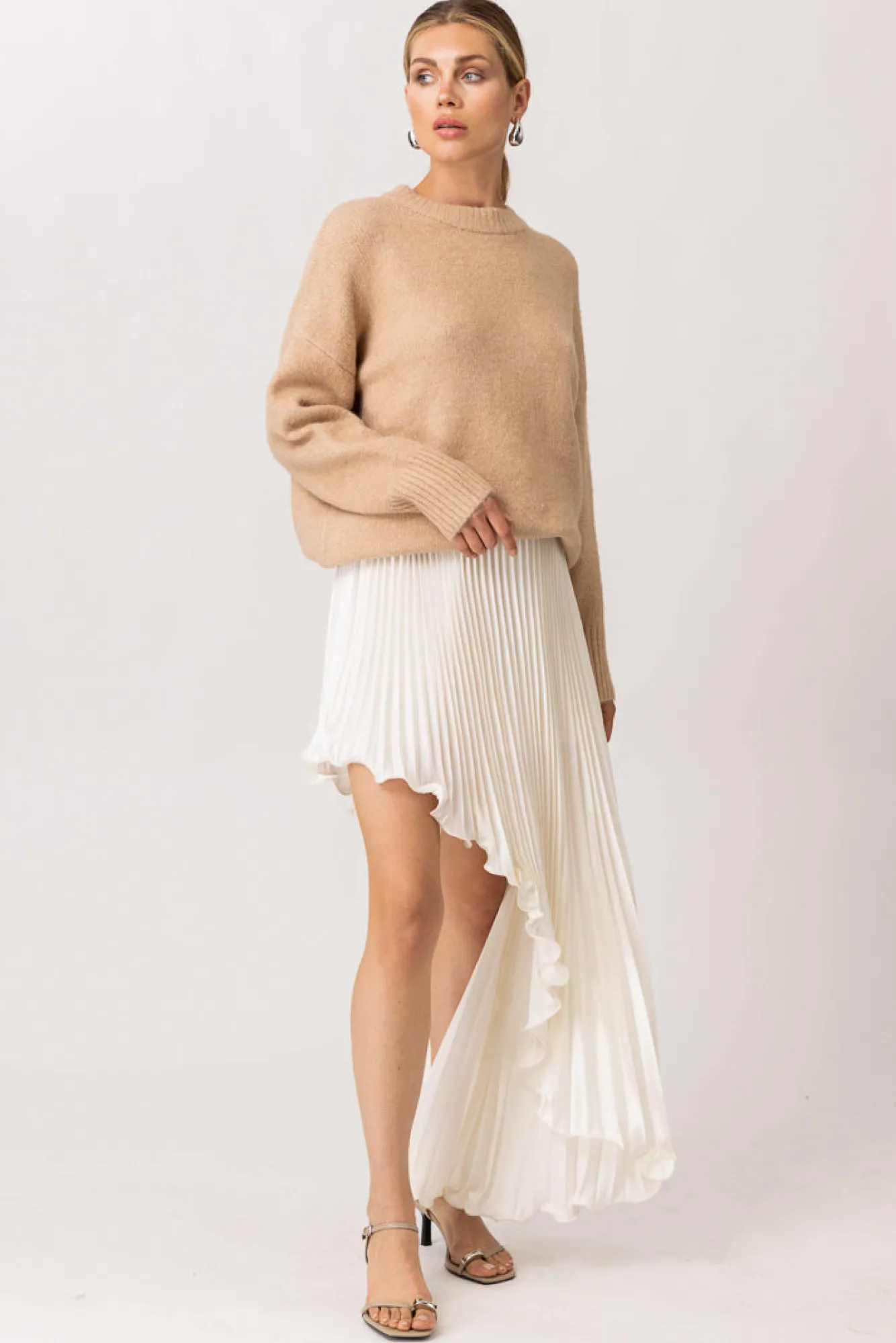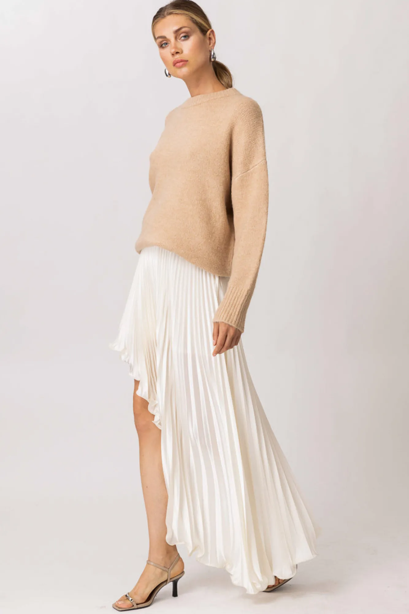 – Mid-weight satin fabric with little stretch- Asymmetrical hemline- Hook-and-eye and hidden side zip- Half lined