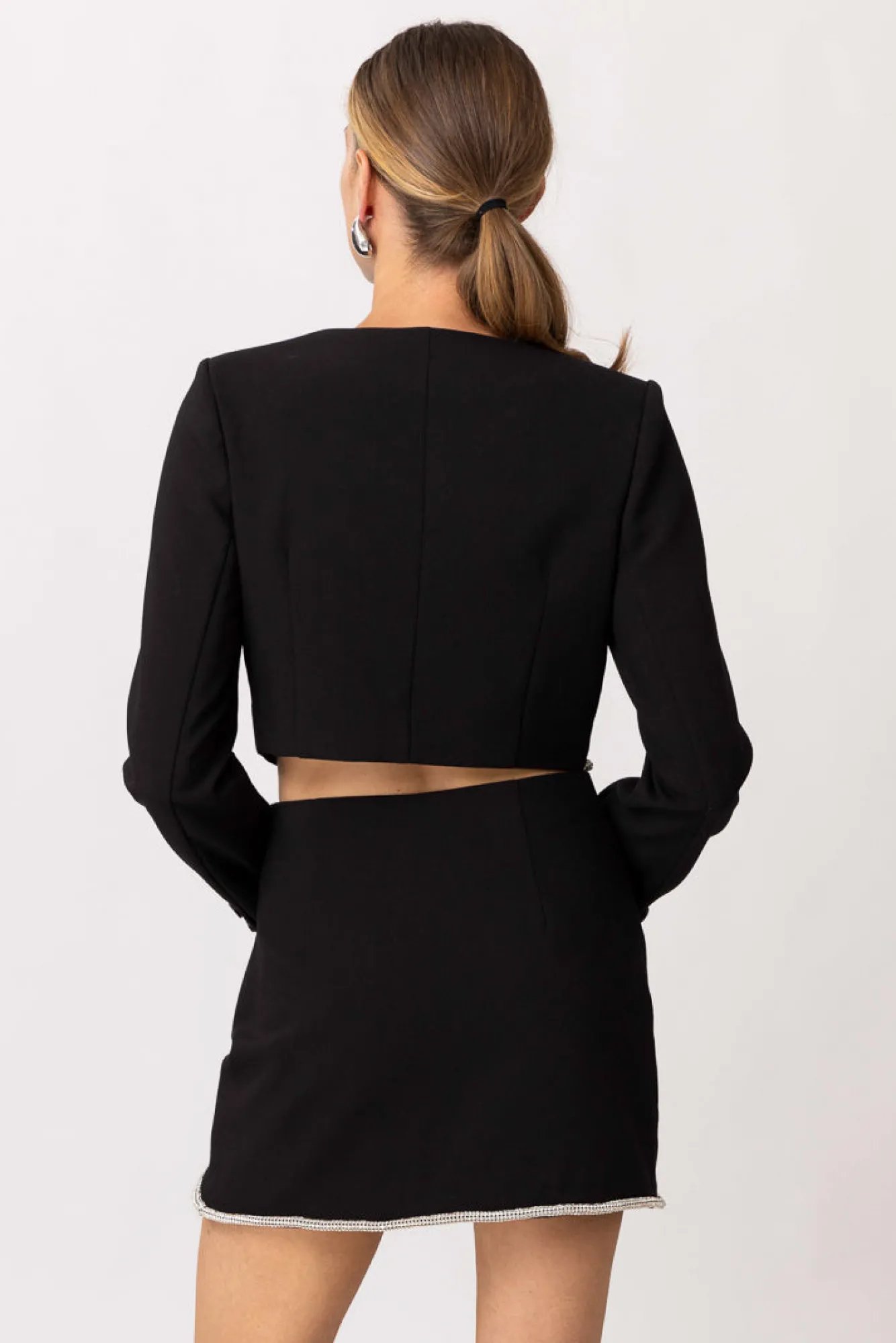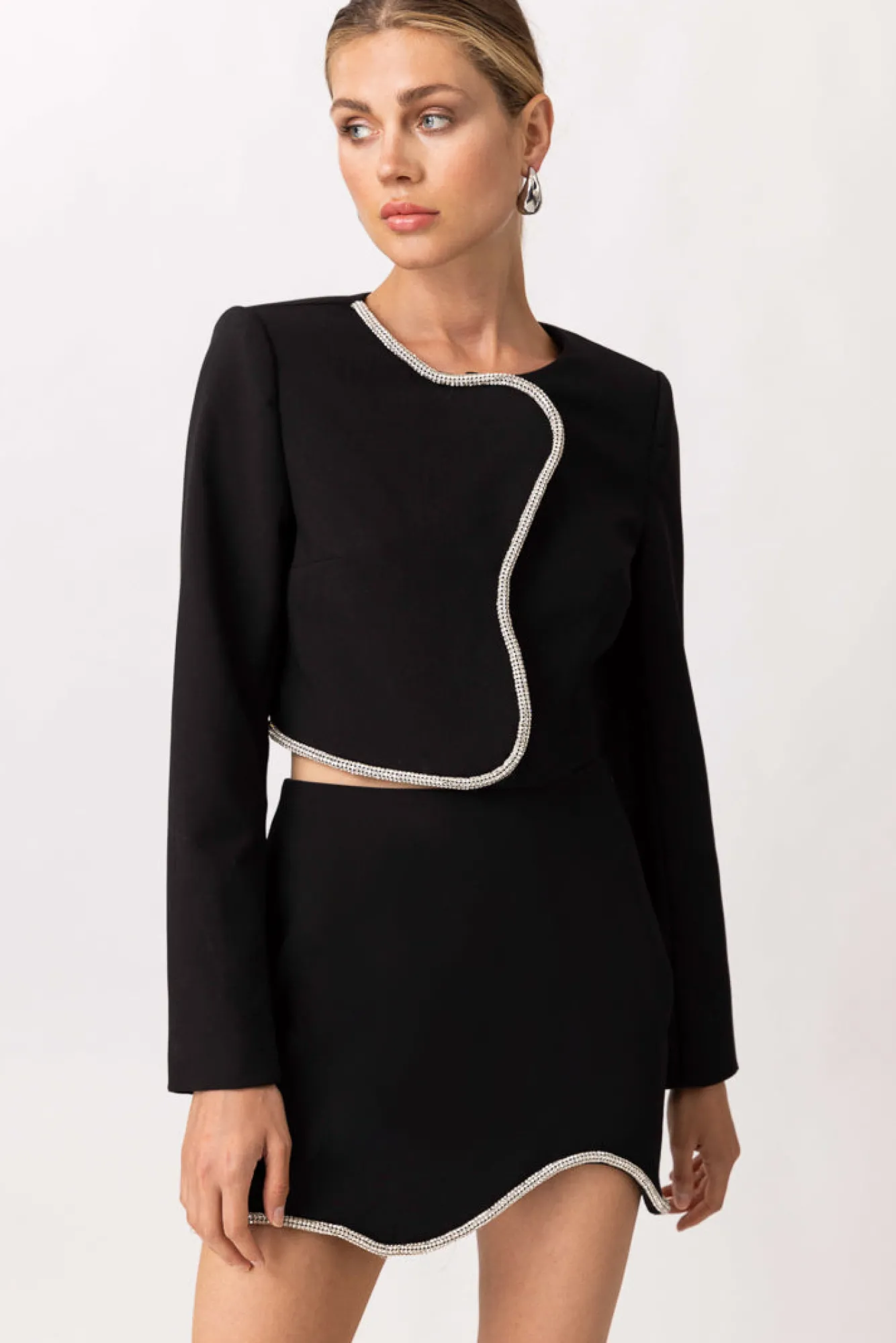 – Mid-weight suiting fabric- Round neckline- Long sleeves- Fully lined