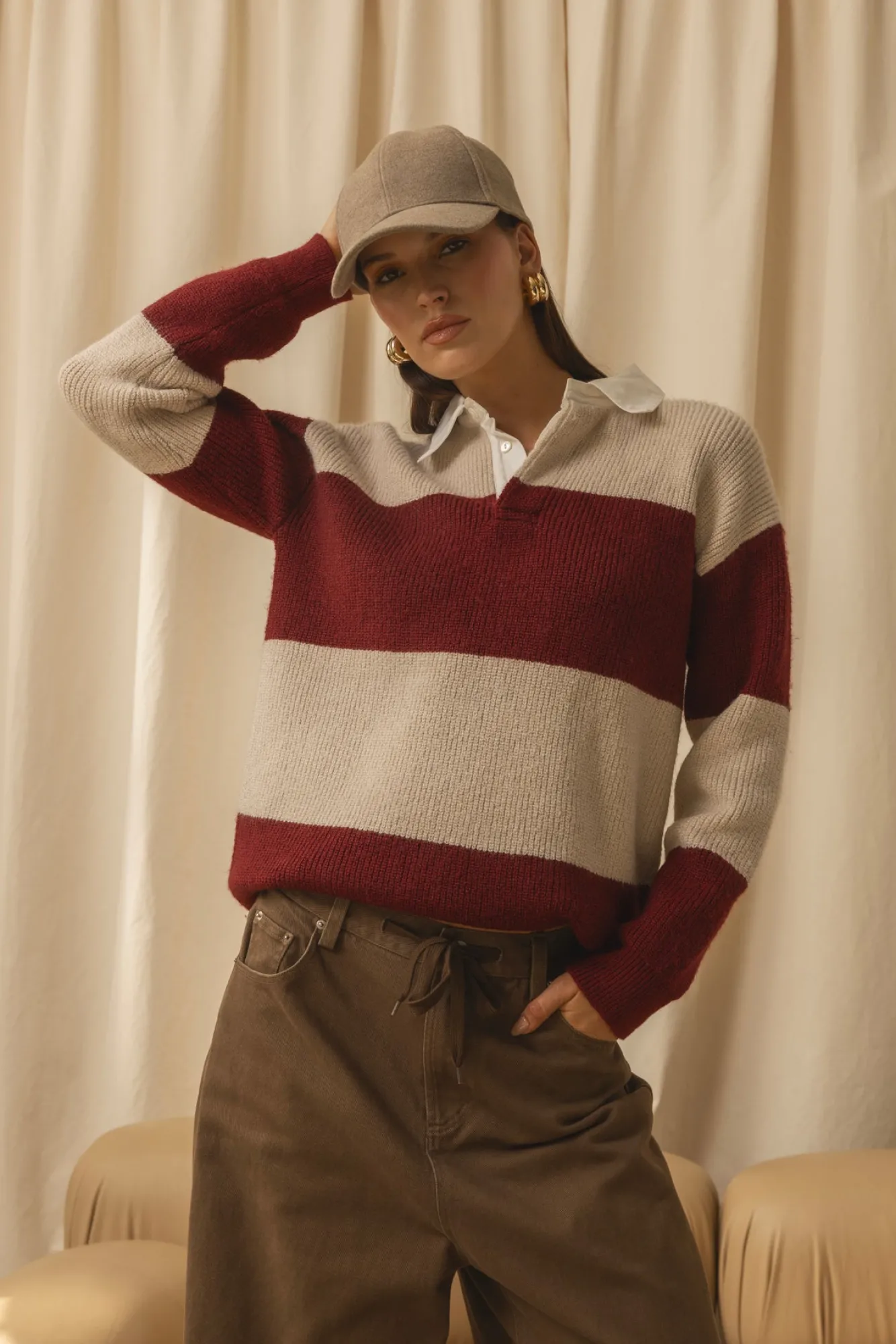 – Mid-weight ribbed knit fabric- Stripe pattern- Woven collared neckline- Long sleeves- Partial button placket
